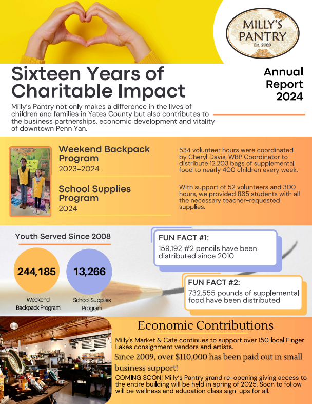 The impact Milly's Pantry has on our community is due to the very support we receive from our community. We would like to share our gratitude for the years of continuous support we receive from our donors and specifically thank the granting agencies, partners and our local businesses who show the value MIlly's Pantry has in their community by their in-kind and monetary donations. Our donors and partners, like all non-profits, are critical to our mission but most importantly to building a strong community that supports the charitable efforts bringing success to the lives of children and families that need it the most . Thank you for making our mission possible!