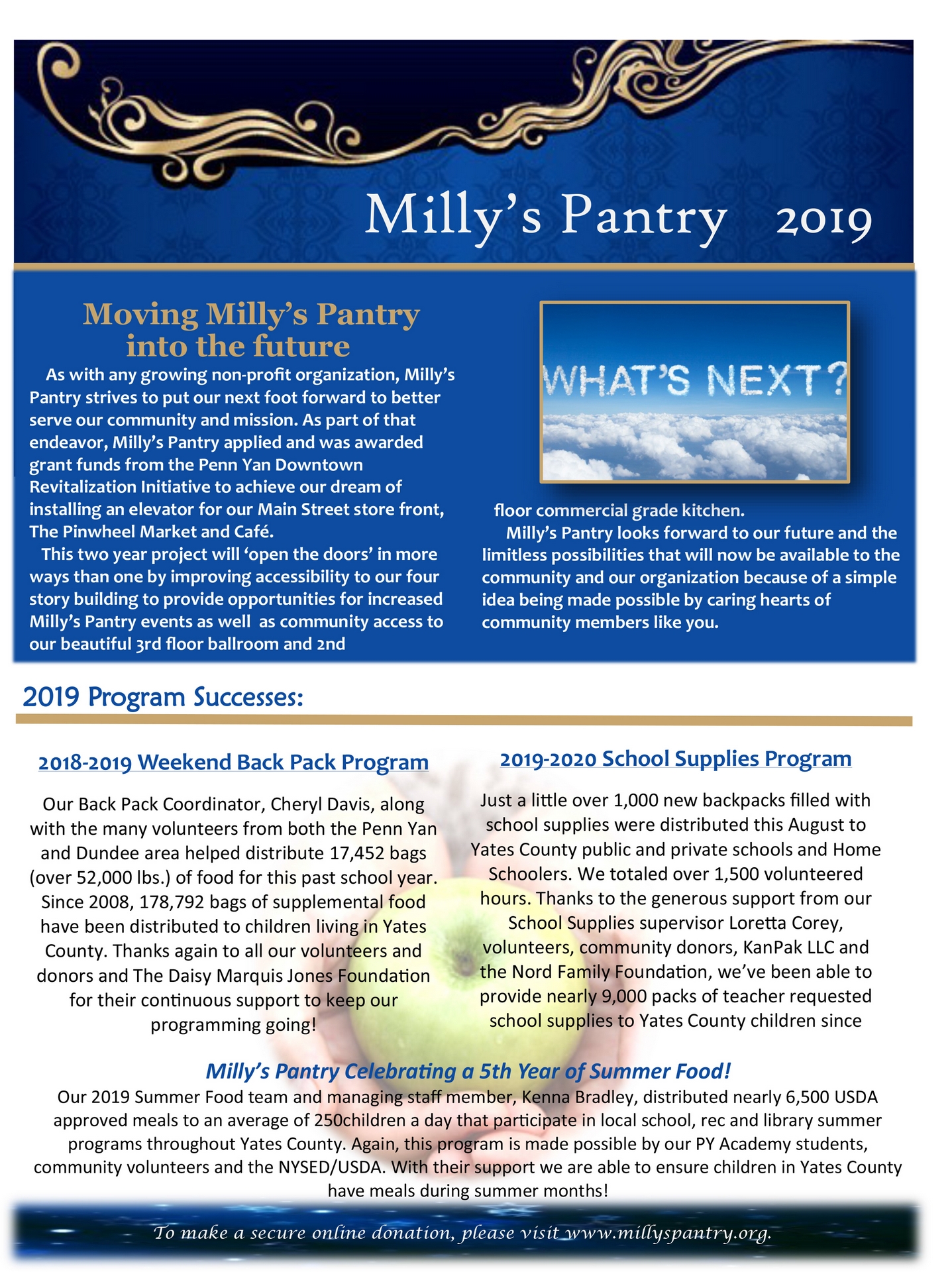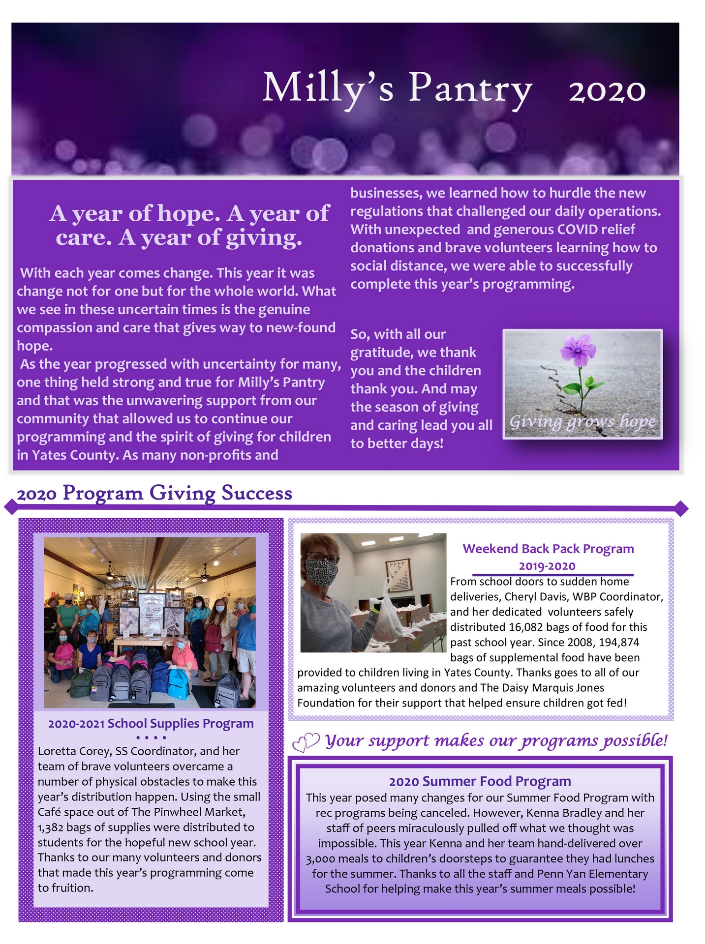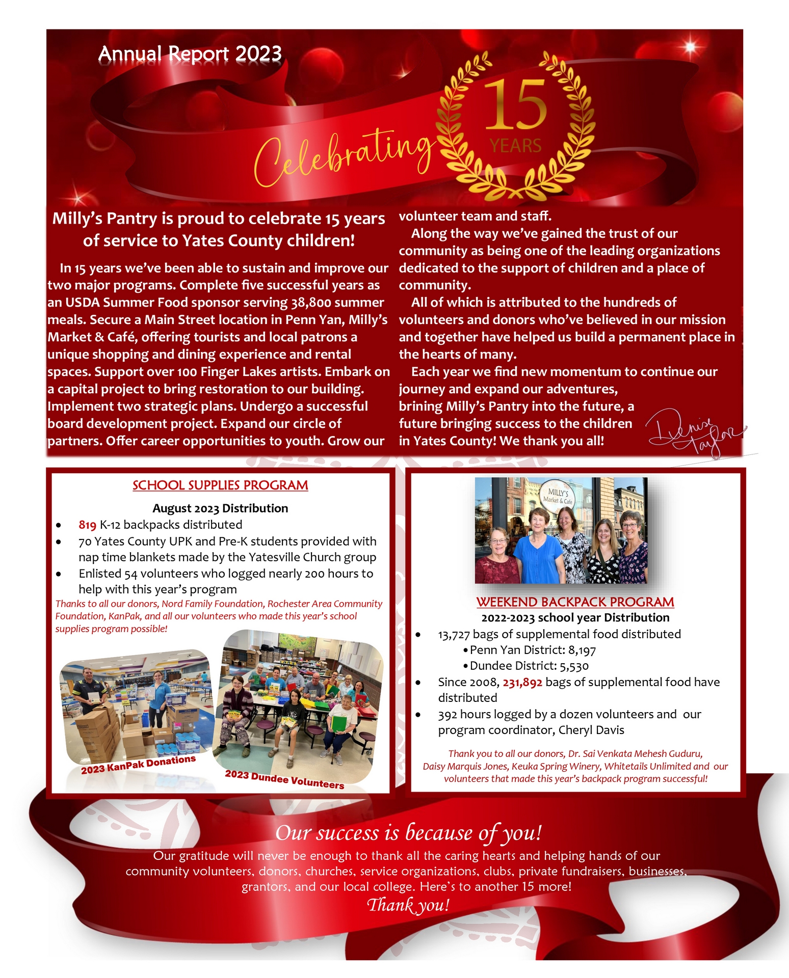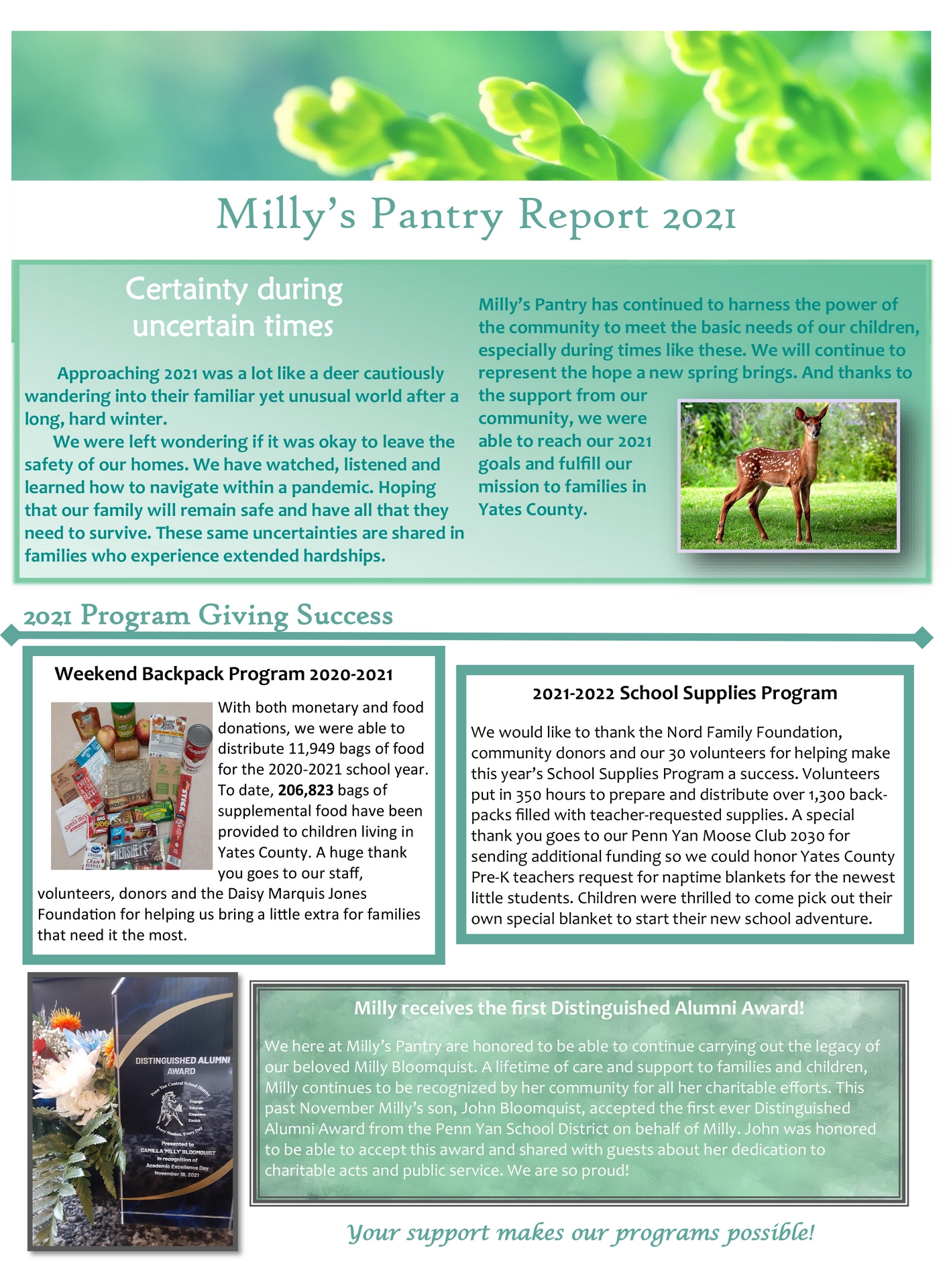 The impact Milly's Pantry has on our community is due to the very support we receive from our community. We would like to share our gratitude for the years of continuous support we receive from our donors and specifically thank the granting agencies, partners and our local businesses who show the value MIlly's Pantry has in their community by their in-kind and monetary donations. Our donors and partners, like all non-profits, are critical to our mission but most importantly to building a strong community that supports the charitable efforts bringing success to the lives of children and families that need it the most . Thank you for making our mission possible!
